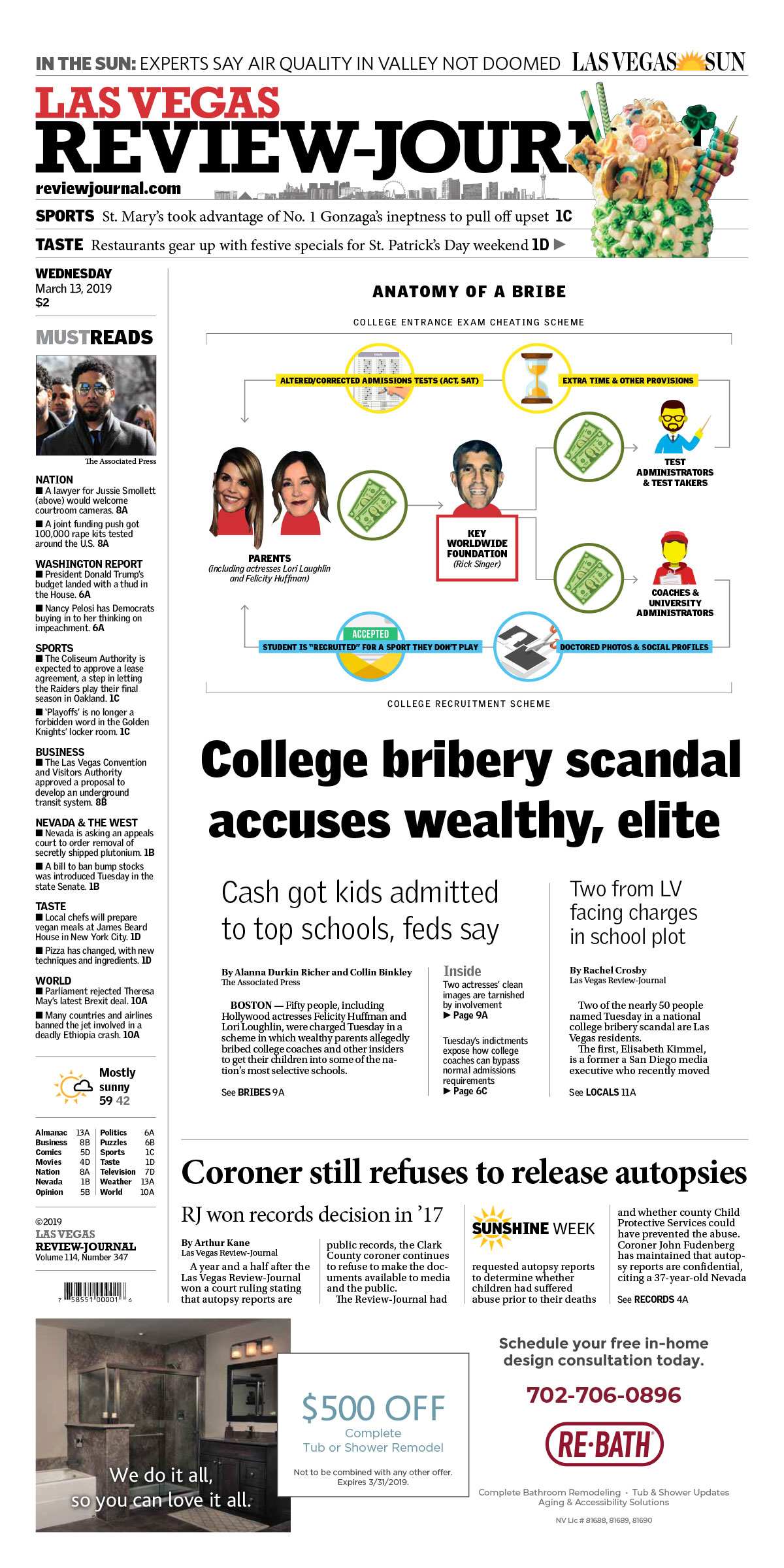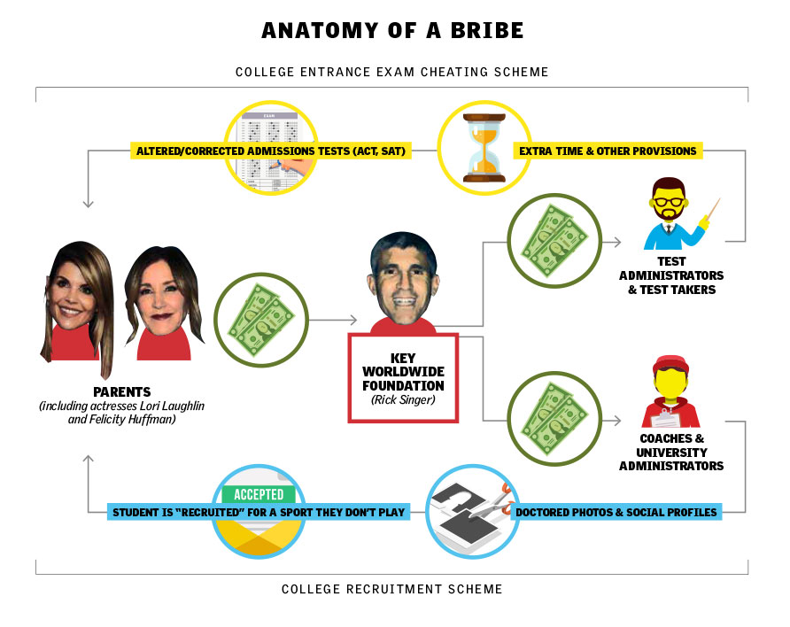 Illustration and front page created on deadline for a story about a major college admissions scheme involving rich parents and collegiate sports.