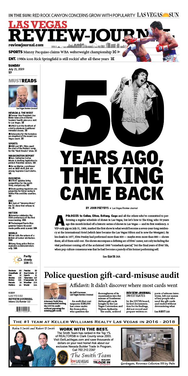 Illustration and front page created for a story celebrating the 50th anniversary of Elvis’ resicency at the International (now the Westgate) in Las Vegas.