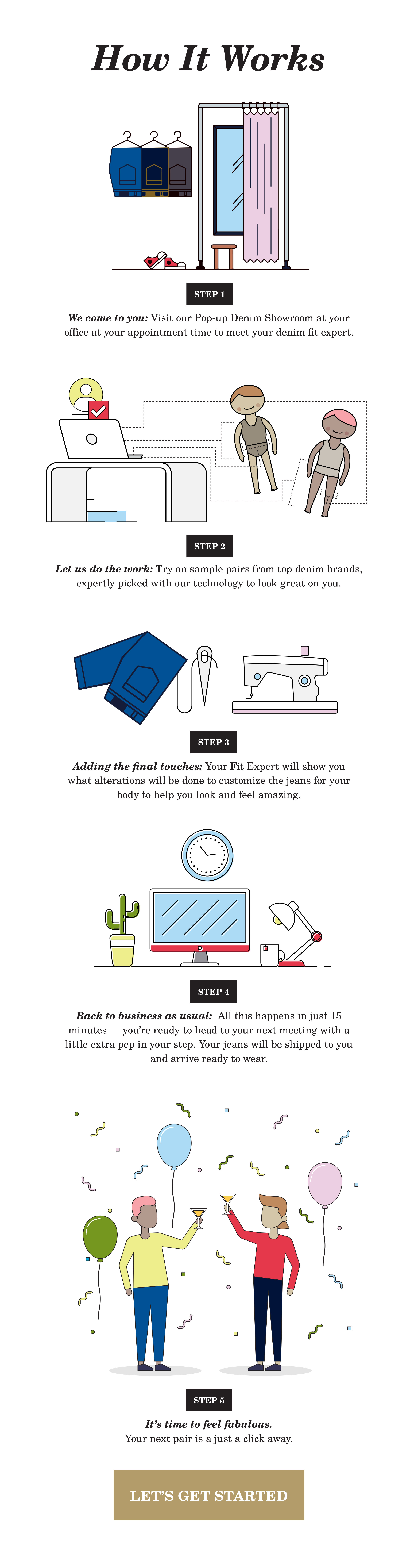 Infographic explaining how ZipFit’s Pop-up Denim Showroom and fit process works.