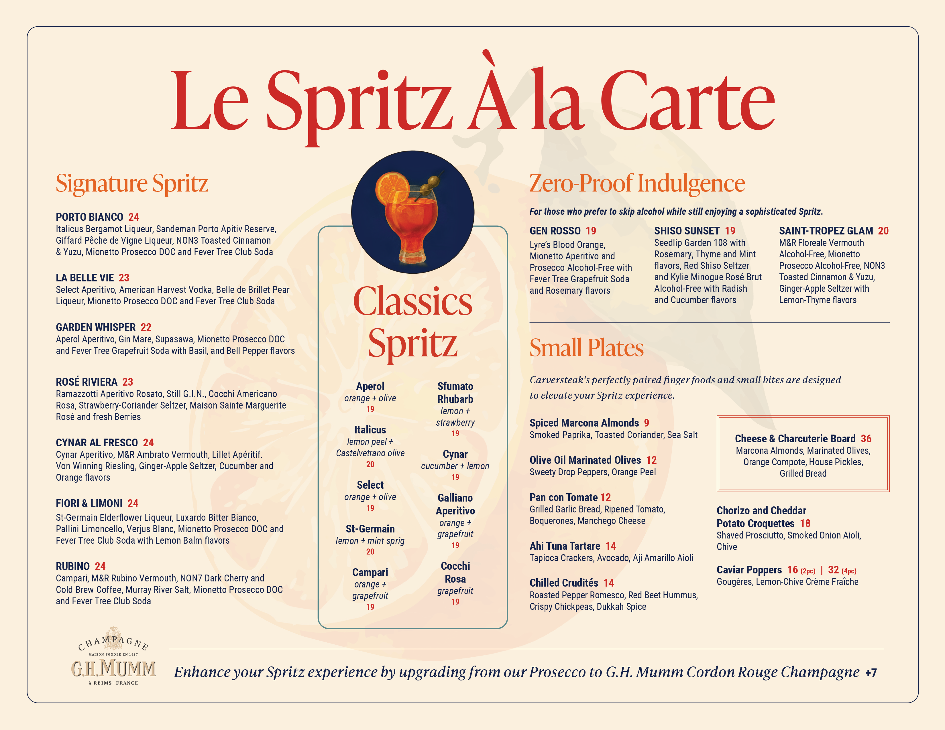 Print menu created for Carversteak’s immensely successful spritz-themed popup on the back patio for spring and summer 2025 (and then extended through the holidays with a seasonal update). Printed on a heavy cardstock so that it would stand tented upon the table.